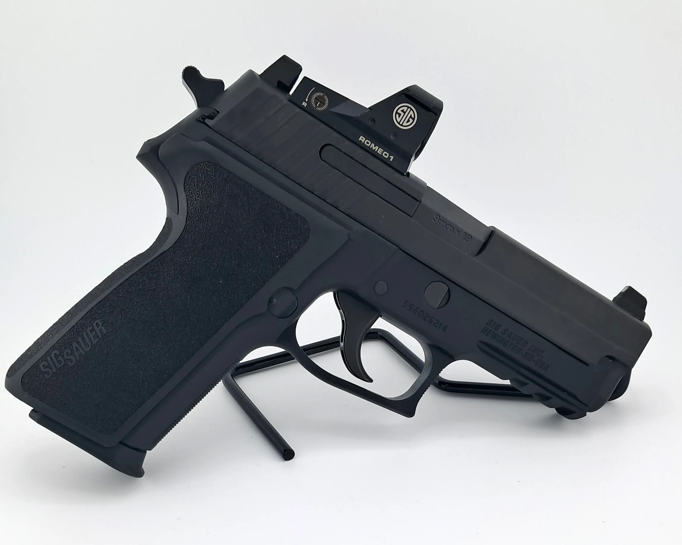 A classic SIG Pistol. Has suppressor height day/night sights for a perfect co-witness with the installed ROMEO1 optic.